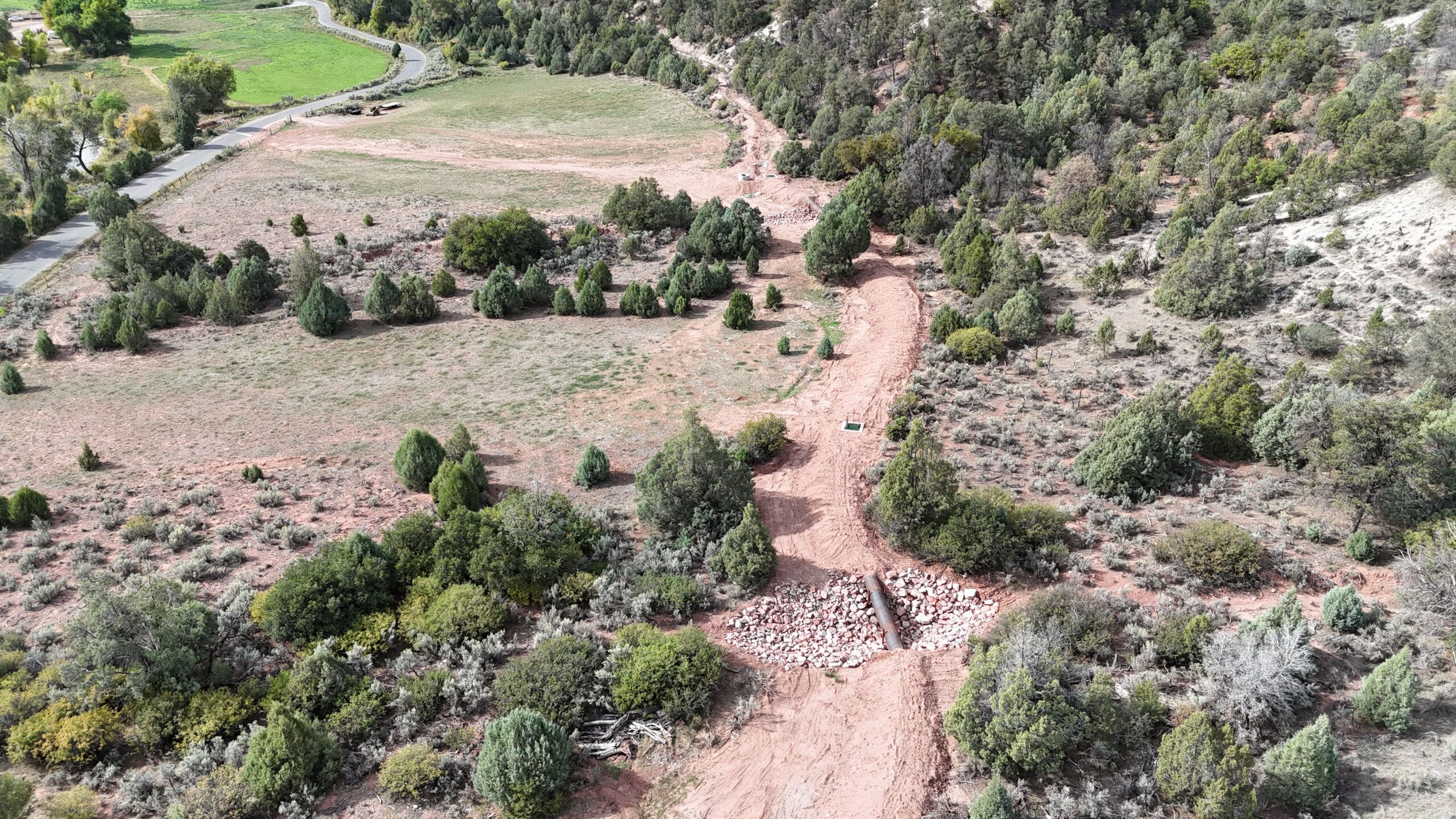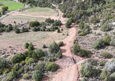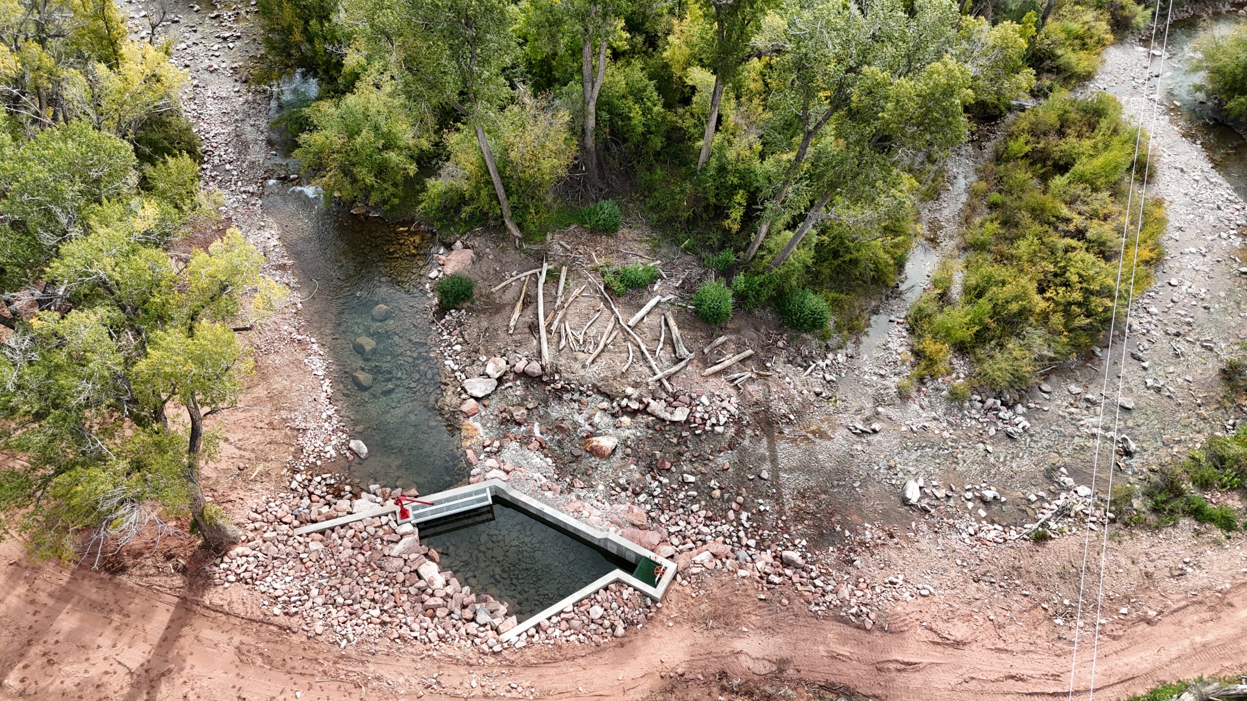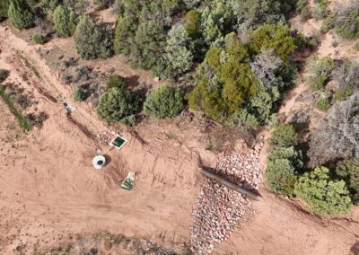 In addition, Kissner placed a total of 2,423 LF of 30″ HDPE pipe, 502 LF of 24″ HDPE pressure pipe, and 100 LF of 30″ steel pipe. Kissner installed buried cable for telemetry as well. The diversion structures were backfilled and compacted, and boulders were placed to create wall crests. Final grading and seeding completed the project.